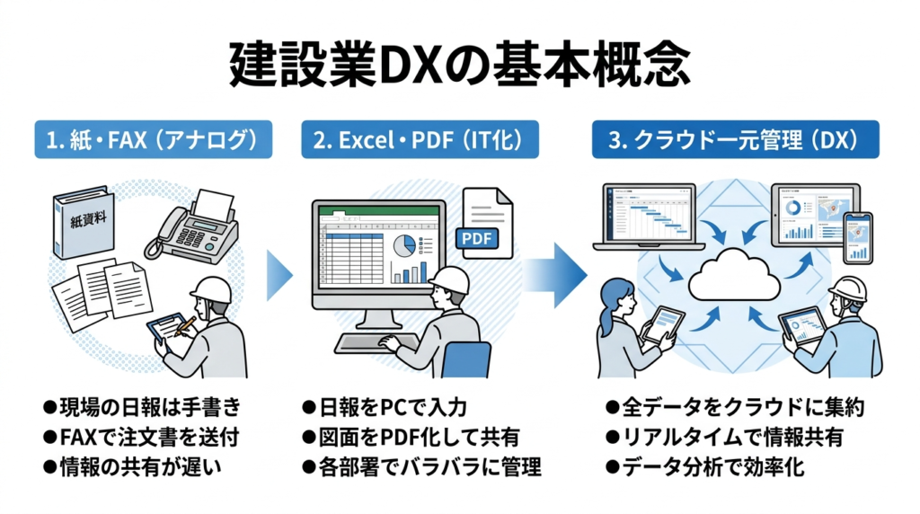 - DX: クラウド上で工程・写真・日報・原価を一元管理し、現場と事務所がリアルタイムで情報を共有できる仕組みを作ること。業務の流れそのものが変わる