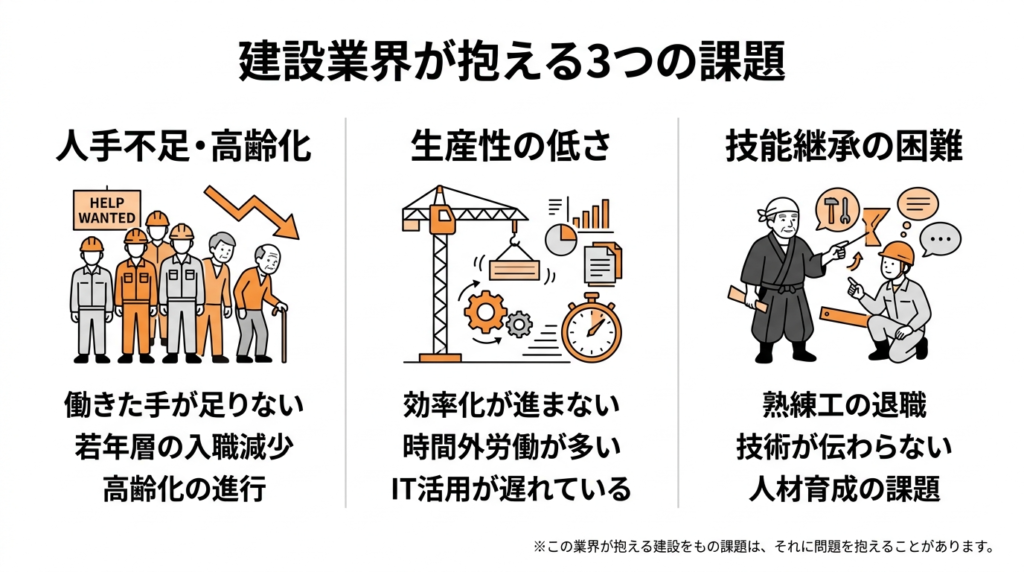 2つ目は、深刻な人手不足と高齢化。これは従業員数百人の中堅企業だけでなく、5人・10人の工務店でも「求人を出しても応募が来ない」という切実な声が聞かれる問題です。