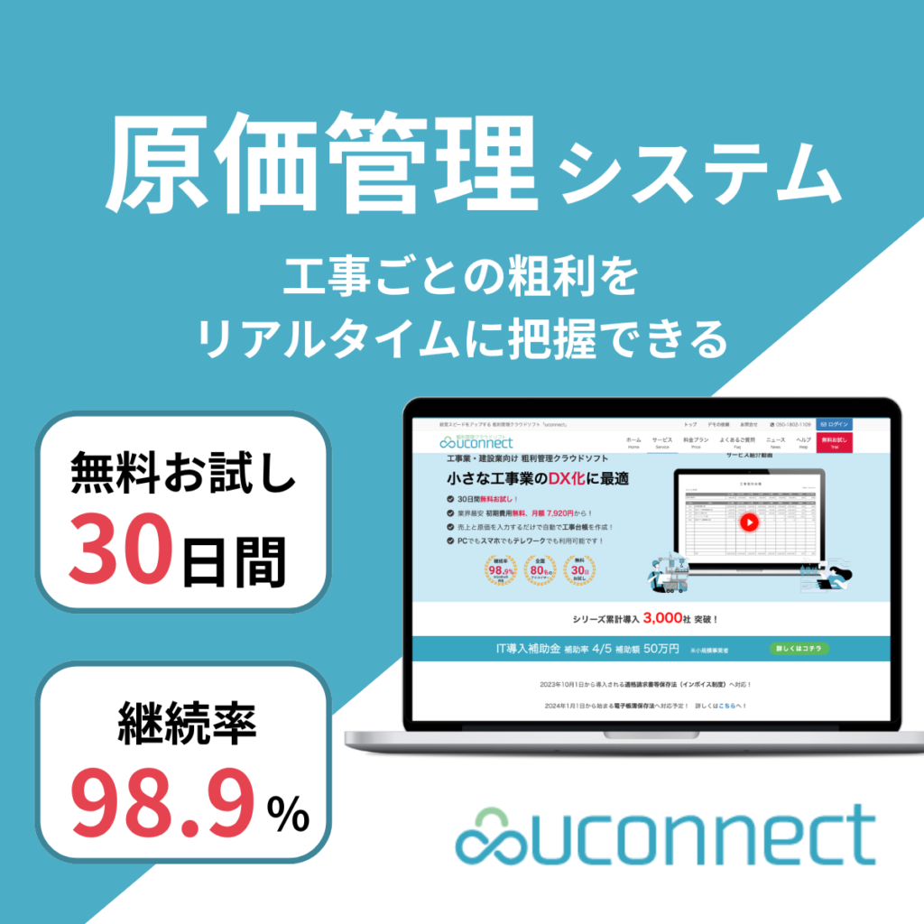 こうした課題に対して、建設業向けのクラウド型粗利管理ソフト「uconnect」を活用するという方法があります。シリーズ累計3,000社以上の建設会社に導入されており、継続率は98.9%です。