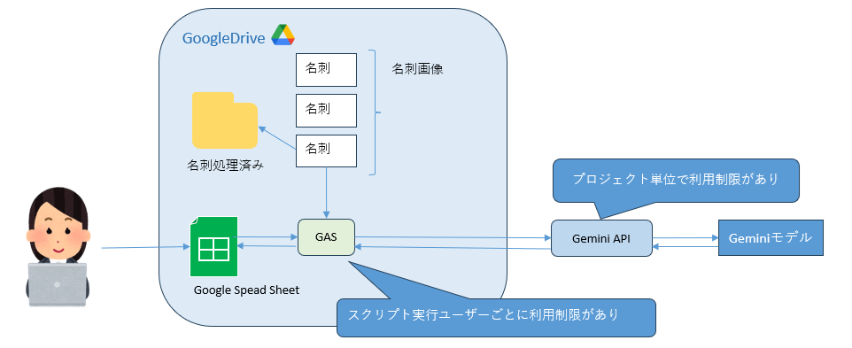 名刺画像からデータを抽出したり、共有ドライブのファイルを移動したりするため、スプレッドシートのスクリプト(Google Apps Script)からHTTPリクエストを送信しています。