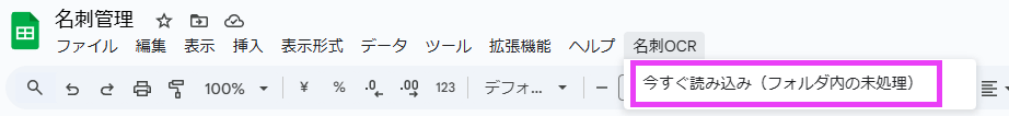 メニューの「名刺OCR」>「いますぐ読み込み(フォルダ内の未処理)」をクリックすると、「FOLDER_ID」で指定したフォルダ内の画像ファイル(JPEG・PNG)、およびPDFファイルを読み込みます。