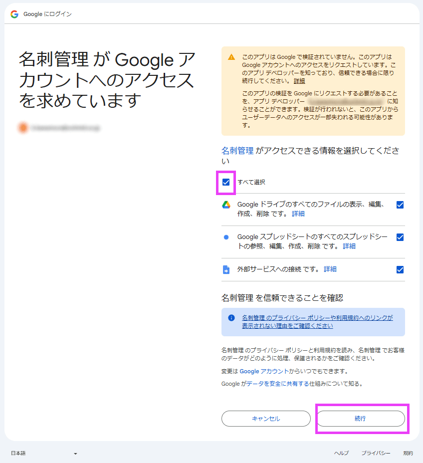 スクリプト実行に必要なアクセス権が表示されます。内容を確認後、問題なければ「すべて選択」にチェックをし「続行」します。