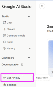 Geminiを利用する為、Geimini APIキーを取得します。Gemini APIキーはGoogle AI Studioから取得できます。