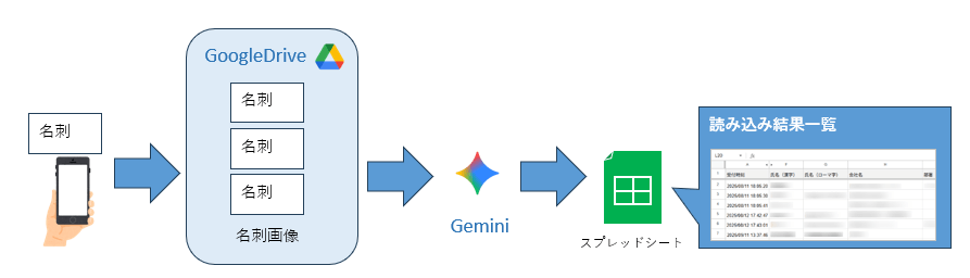 このアプリは、Google Drive™Google スプレッドシート™を活用し、組織全体で名刺情報を一元管理・共有することを目的として開発されました。Gemini™のAI技術が面倒なデータ入力を自動化し、誰もが簡単に情報へアクセスできる環境を構築します。